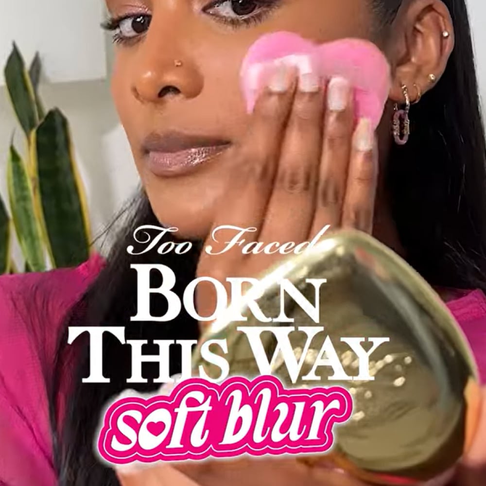 Usando um pincel para pó ou esponja, pressione o Pó Compacto Born This Way Soft Blur no rosto para um acabamento com efeito de filtro.